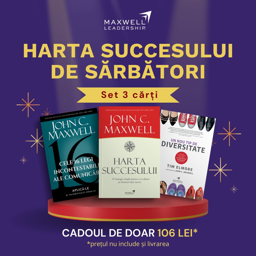 Setul de cărți "Harta Succesului de Sărbători" conține "Harta succesului", de John C. Maxwell (38 lei), "Cele 16 legi incontestabile ale comunicării", de John C. Maxwell (43 lei) și "Un nou tip de Diversitate", de Tim Elmore (43 lei).